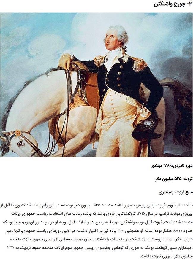 Adjusted for inflation, the first president’s fortune would today stand at $525 million, according to a figure reported by Business Insider in 2017.This made him the wealthiest person to win the presidency until Trump’s 2016 victory.Washington’s fortune was bound to his vast estates in Mount Vernon, Virginia, which stretched across 8,000 acres in Virginia. He also owned 300 slaves.