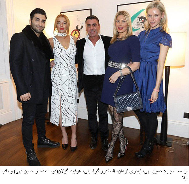 Hossein Tohi, Lindsay Lohan, Alessandro Grassini-Grimaldi, Hofit Golan and Nadya Abela attend an afternoon tea hosted by Damiani in aid of Nadedza Foundation at Morton’s Club in London, England.