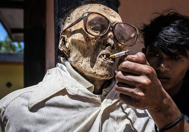 The burial process begins with the sacrifice of buffaloes and bulls. The Torajans then use their horns to decorate the home of the deceased.