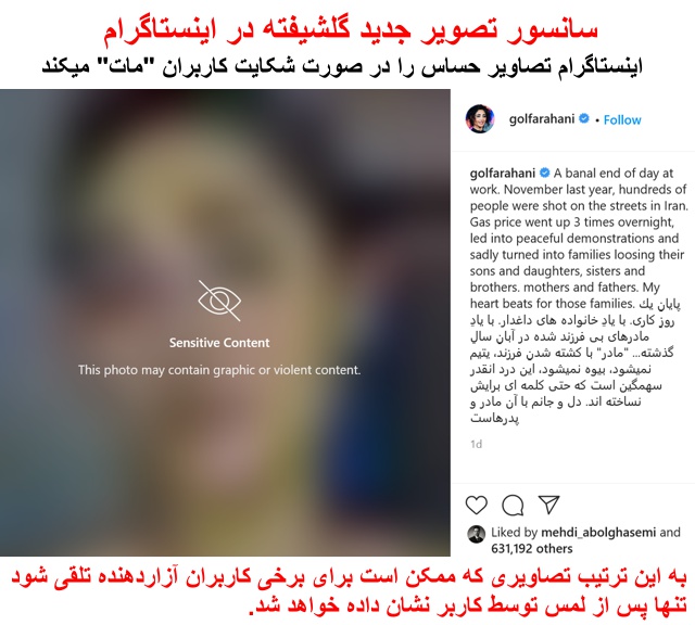 Golshifteh Farahani (born 10 July 1983) is an actress. She was nominated for the Most Promising Actress Award for The Patience Stone at the 2014 Cesar Awards in France, and won the Best Actress Award for Boutique from the 26th Nantes Three Continents Festival (France). To block the sharing of information regarding the protests and the deaths of hundreds of protesters on social media platforms, the government shut down the Internet nationwide, resulting in a near-total internet blackout of around six days. Many items are forbidden on Instagram that Instagram will remove them, and if the user keeps violating Instagram’s rules, the account will be banned.