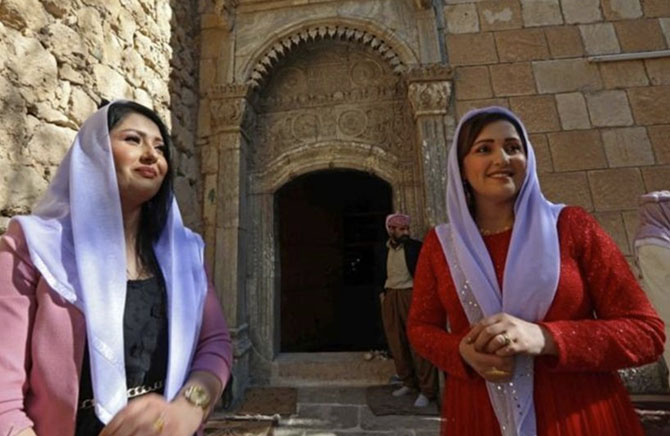 A woman kisses the hand of the new ‘Baba Sheikh,’ or Yazidi spiritual leader, Ali Elias Haji Nasir, at his Lalish Temple inauguration near Duhok, Iraq, yesterday.