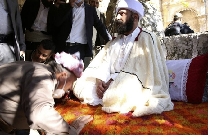 On Wednesday, hundreds of worshipers wearing medical masks gathered at the stone shrine of Lalish to pay their respects to the new leader.