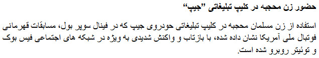 A number of conservative Americans have taken offense at a Jeep advertisement that ran in the United States during the Super Bowl this past Sunday. The commercial depicted scenes from all over the world set to the classic American folk song, “This Land is Your Land”. At one point in the commercial, a woman is shown wearing a hijab, standing in the foreground of a mountain range. The shot lasts approximately two seconds, and is preceded and followed by shots of India, China, Brazil, and Australia, among others.