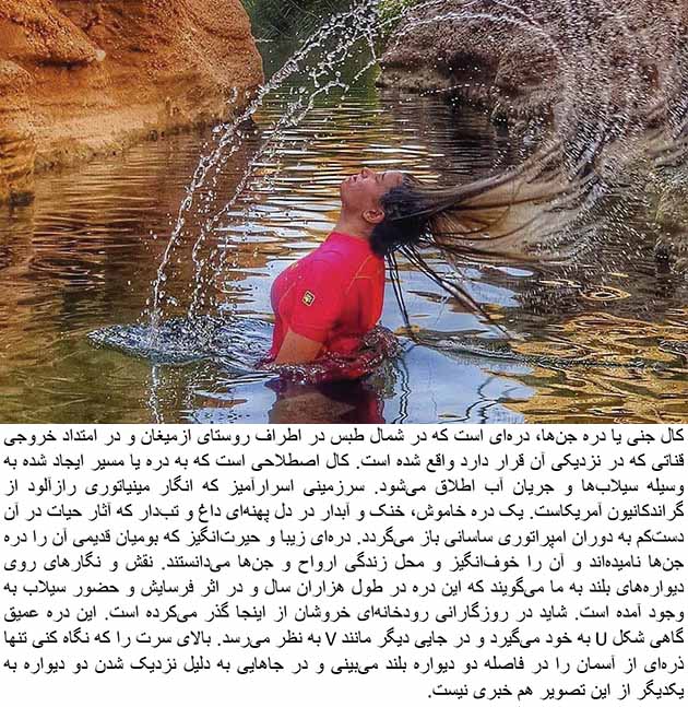 The water of Kal-e Jeni is being transferred by a canal to a village called Tashkuni that historians believe is the village that Cyrus the Great spent first 16 years of his life in there. Kal-e Jeni means the canal of Jinn and is known as a mysterious place among the locals of the area.