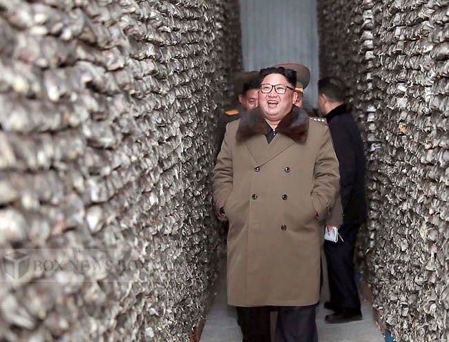 The beaming dictator walked through corridors of frozen fish piled high as he visited the fishermen on the eastern coast.