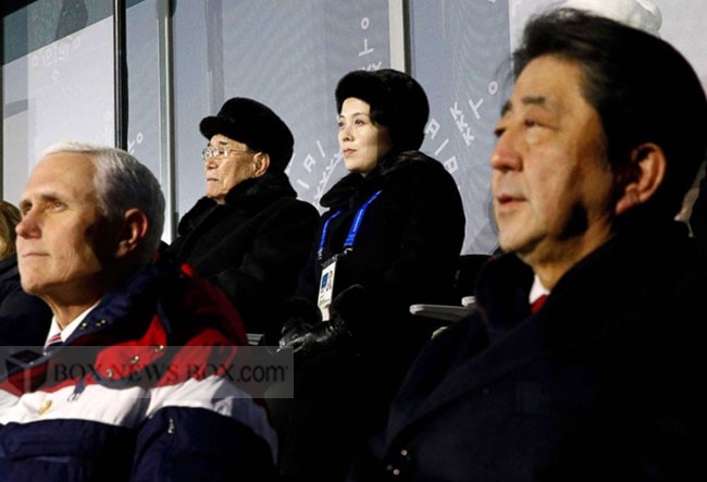 She and Kim Yong Nam, the North’s 90-year-old nominal head of state, were seated behind Moon and his wife, while Pence and his wife were seated beside the Moons and Japanese Prime Minister Shinzo Abe.