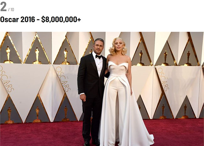 Lady Gaga wore Brandon Maxwell on several occasions. The stylist is responsible for the meat dress, which is also on this list, and dressed the artist on several red carpets. One of them was the Oscar 2016 when Gaga wore a white pantsuit.