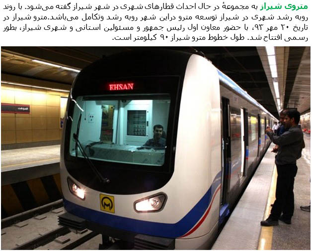 The Shiraz Metro is the rapid transit system in Shiraz, the capital city of Fars Province and the largest city in southern Iran. Construction of Shiraz Metro began in 2001 because of traffic problems and high population density. Line 1 opened for service on 11 October 2014.