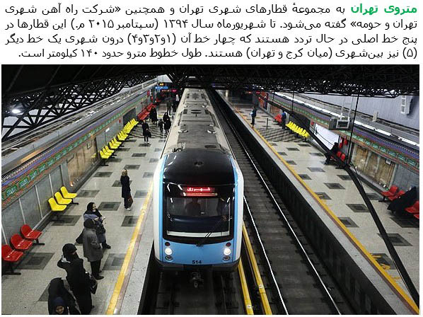 The Tehran Metro is a rapid transit system serving Tehran, the capital of Iran. The system consists of four operational metro lines (and a fifth regional rail line), with construction begun on a further two lines in 2007.The Tehran Metro carries more than 3 million passengers a day.[3] In 2014, 815 million trips were made on Tehran Metro. As of 2015, the total system was 170 kilometers (110 mi) long, 127 kilometers (79 mi) of which it metro-grade rail. It is planned to have a length of 430 kilometers (270 mi) with 9 lines once all construction is complete by 2028.On all days of the week, the Metro service runs from approximately 05:30 to 23:00.