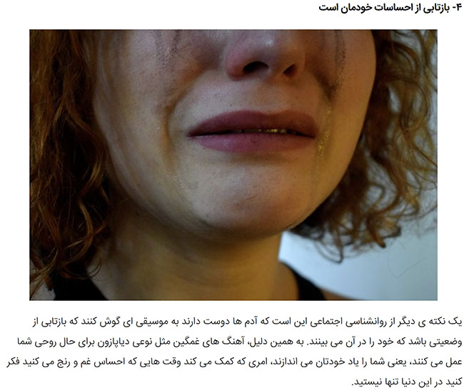 Another point from social psychology is that people like to listen to music that mirrors the tone of the situation they find themselves in. In this case, sad songs act as a sort of tuning fork for your own mood – they resonate with you, helping you feel that you are not alone when experiencing pain and sorrow in this world.