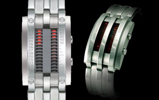 The STORM MK2 Circuit watch has a modern design and futuristic appeal. This best selling watch is made from silver and black brushed stainless steel and features a red LED vertical display that indicates the time at the press of a button. The lights on the left denote hours and AM/PM; those on the right show the minutes in tens (10-50) and single figures (1-9). Waterproof to 50m with easy change battery and date function.