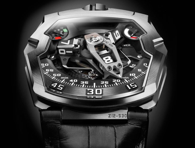 Urwerk are probably best known for their signature satellite indicators with spinning hour markers. Their latest model has a three dimensional cage that was apparently inspired by the beak of the Maltese Falcon. Either side of this are a traditional power reserve indicator at one o’clock with a red/white indicator. While on the opposite side using red/green there is the worlds first “winding efficiency indicator”.