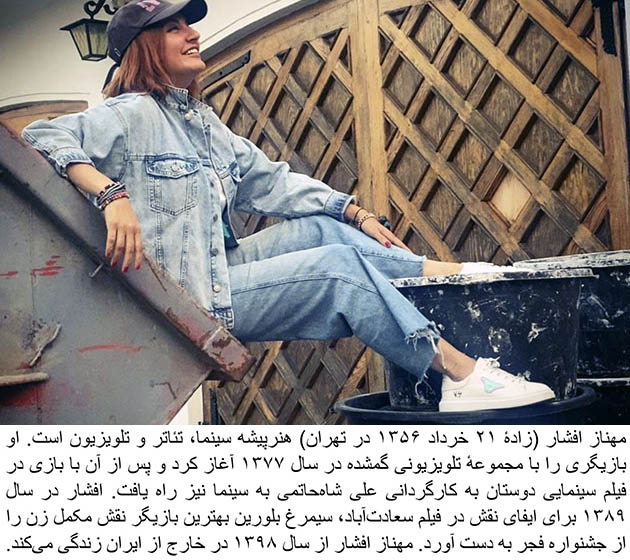 Mahnaz Afshar ( born 10 June 1978) is an actress who has been active since 1998 with acting in cinema and television 9series. She graduated in natural science in high school. After graduation, one of her relatives who was the Theater Affairs Assistant in “Soureh” college introduced her to “Hannaneh” Art institute. Having studied video edition in the following years, she participated in assembly job of “Ketāb-e Avval as a Golddigger” training materials, directed by Dariush Mehrjui.