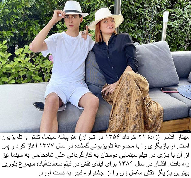 [custom_adv] Mahnaz Afshar (born 10 June 1977) is an actress. She gained wide recognition in the record-breaking film Cease Fire. [custom_adv] She graduated in natural science in high school. After graduation, one of her relatives who was the Theater Affairs Assistant in "Soureh" college introduced her to "Hannaneh" Art institute. Having studied video editions in the following years, she participated in the assembly job of "Ketāb-e Avval as a Golddigger" training materials, directed by Dariush Mehrjui. [custom_adv] Later on, she was invited by Shamsi Fazlollahi to act in a TV series called Gomshodeh (Lost) directed by Masoud Navaii, making her first official play in the TV industry. Her professional career continued by acting in a movie called "Doostam" (Friends) directed by Abdollah Eskandari. The film, however, was not released in movie theaters due to complications with the authorities regarding the story and morals of the film. [custom_adv] Her first official appearance as an actress in the cinema industry debuted in a work called "Shour-e Eshgh" (Passion of Love), which received positive reviews by audiences and critics of the time. Having gained substantial fame for her act, she later appeared in "Atash-bas" (Ceasefire), a major hit, and "Salad-e Fasl" (Season Salad). [custom_adv] Afshar is one of the judges of Persia's Got Talent, a franchise of the British talent show Got Talent, which is aired on MBC Persia. Afshar wrote on Twitter in October 2019 that she and Yasin Ramin had divorced. [custom_adv] ”Each person, strong or weak, has an existence. But when you decide to be a single mum, you have to have two existences. You have to be strong for yourself and your child."