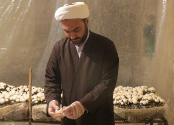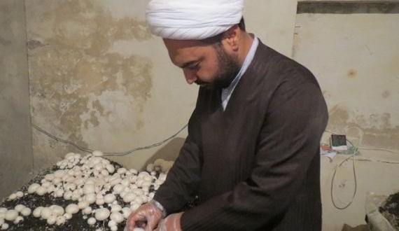 Mushrooms grow from spores — not seeds — that are so tiny you can’t see individual spores with the naked eye. Because the spores don’t contain chlorophyll to begin germinating (as seeds do), they rely on substances such as sawdust, grain, wooden plugs, straw, wood chips, or liquid for nourishment. Below you see a man of the cloth growing these organic mushrooms in the basement of his personal residence. Growing mushrooms don’t require direct sun which makes the basement an ideal location.