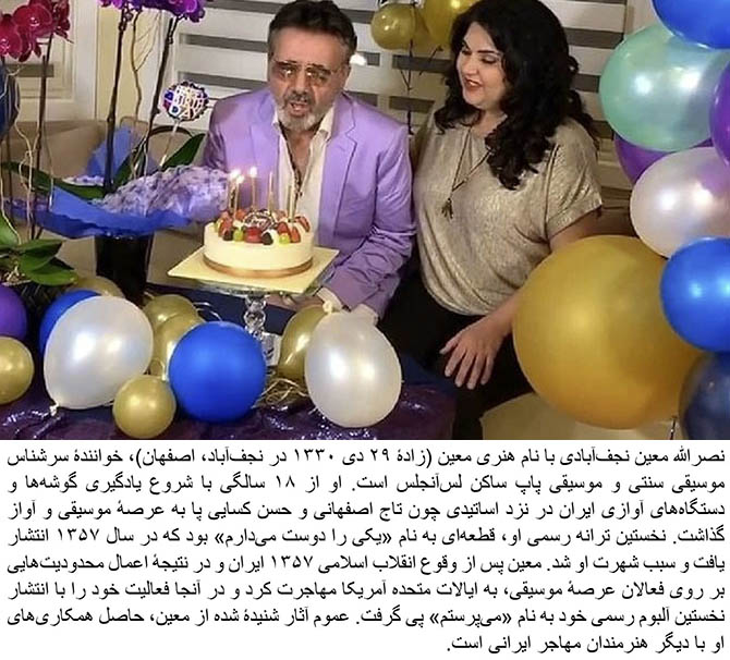 Nasrollah Moein, is a singer. Moein was born in Najafabad, a city in Isfahan Province. Celebrating one’s birthday is a special event that’s meant to be shared with loved ones. In recent years, Moein has become widely acclaimed in and he has played concerts throughout the globe. He is referred to as “Javdan Sedaye Eshgh,” which translates to “The Eternal Voice of Love.”He is one of the Greatest singers in History. He began his artistic career as a radio singer and released several albums before Yeki Ra Doost Midaram in 1986, which was his first album to be widely noticed in.