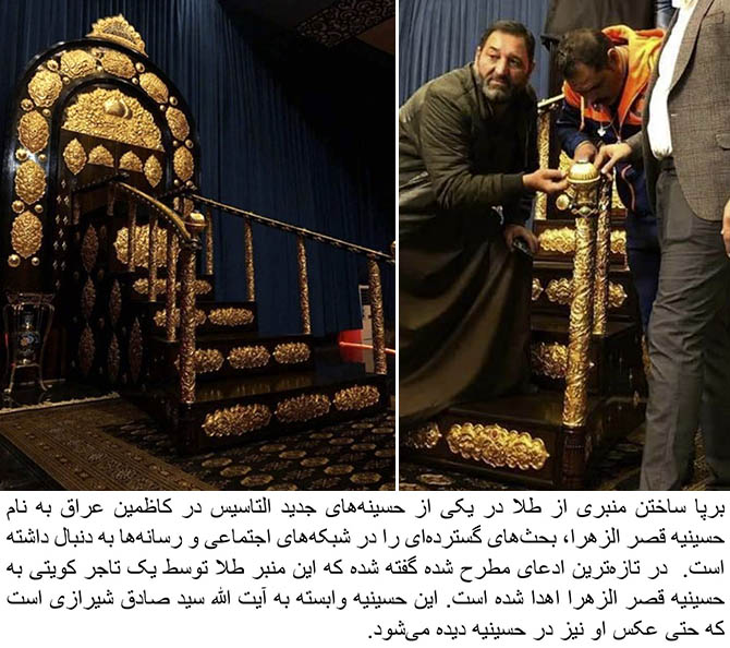 [custom_adv] He raised a video clip circulated by Iraqi activists showing a gold-encrusted pulpit in a Shiite mosque in the capital, Baghdad. [custom_adv] Mosque officials said that the opening of the minbar coincided with the anniversary of the death of Fatima al-Zahra, the daughter of the Prophet Muhammad, may God’s prayers and peace be upon him, and the opening ceremony included poems explaining the reason for resorting to making a minbar from gold. [custom_adv] Activists circulated on social media in Iraq a video clip showing the unveiling of a pulpit encrusted with gold and precious stones in a large ceremony attended by Basem al-Karbalai, "the most famous Shiite singer" (singer), and the preacher Ali al-Talqani; [custom_adv] This is in the Hussainiyya "Zahraa Palace" in the city of Kadhimiya (north of Baghdad), according to what the manufacturer of the platform published on its Facebook page.