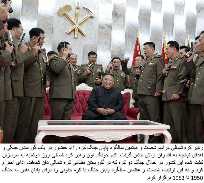 North Korea’s leader Kim Jong Un was shown Monday surrounded by generals posing like gangsters holding commemorative pistols awarded to them to mark the anniversary of the Korean War armistice.