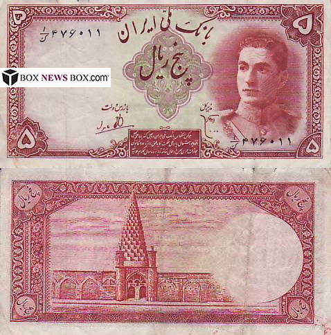 17 – First banknote with portrait of Shah Pahlavi, reddish note from 1944, 5 rials