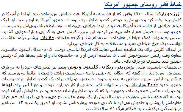 Georges de Paris (c. 1934 – 13 September 2015) was a French-American tailor who is often referred to as having been the President of the United States’ unofficial tailor or the tailor to the Presidents. Paris fashioned suits for every American President from Lyndon Johnson to Barack Obama.De Paris was born in Marseille and came to Washington, D.C with a young woman and after their separation found himself homeless, reportedly bathing in the Potomac. He managed to save money to buy a sewing machine and his reputation grew until President Johnson ordered his suits.De Paris died at the age of 81 in Arlington, Virginia on 13 September 2015 following a prolonged illness.