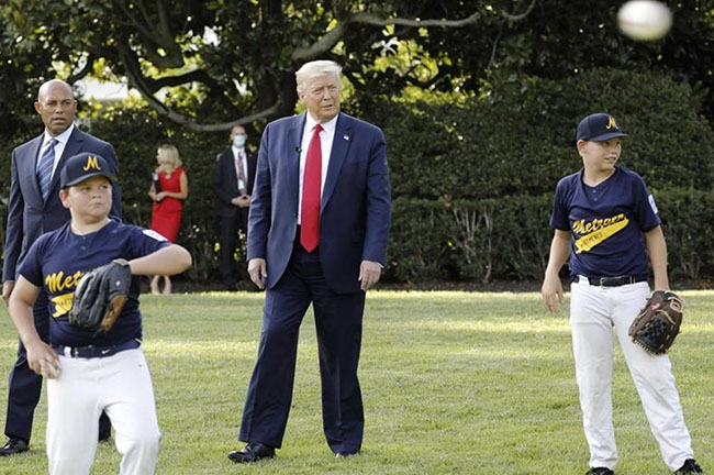 After the briefing, the two joined a group of about 15 young players who were playing catch on the South Lawn. One of the players gave the president and Rivera a glove and ball, and they soon joined in. “There was nobody like Mariano,” Trump said as the two tossed the baseball back and forth.