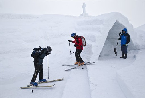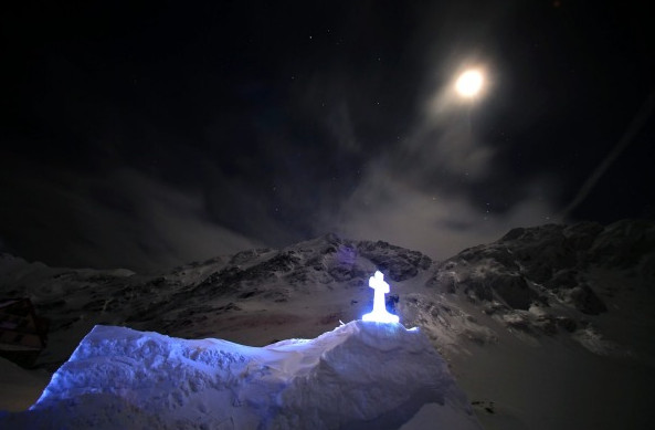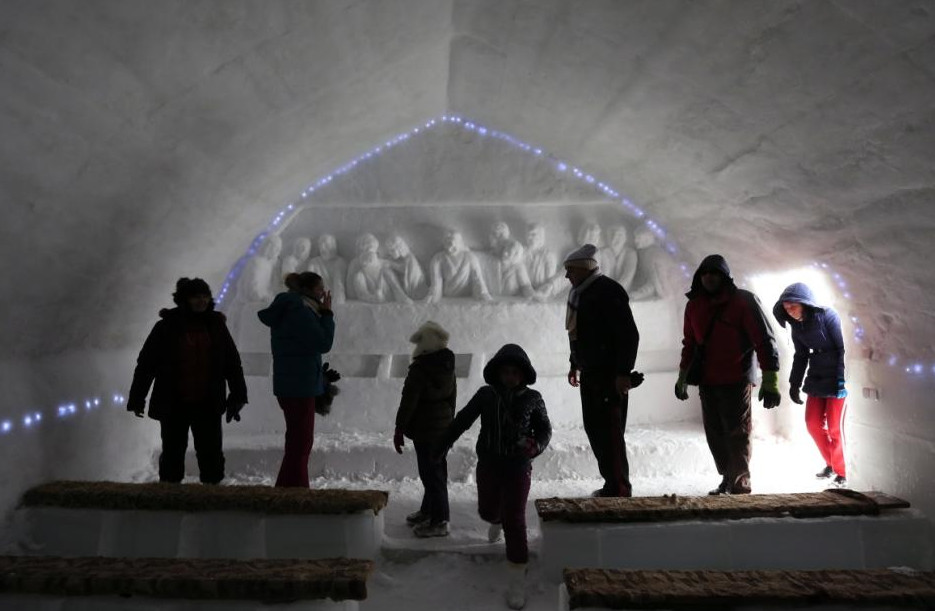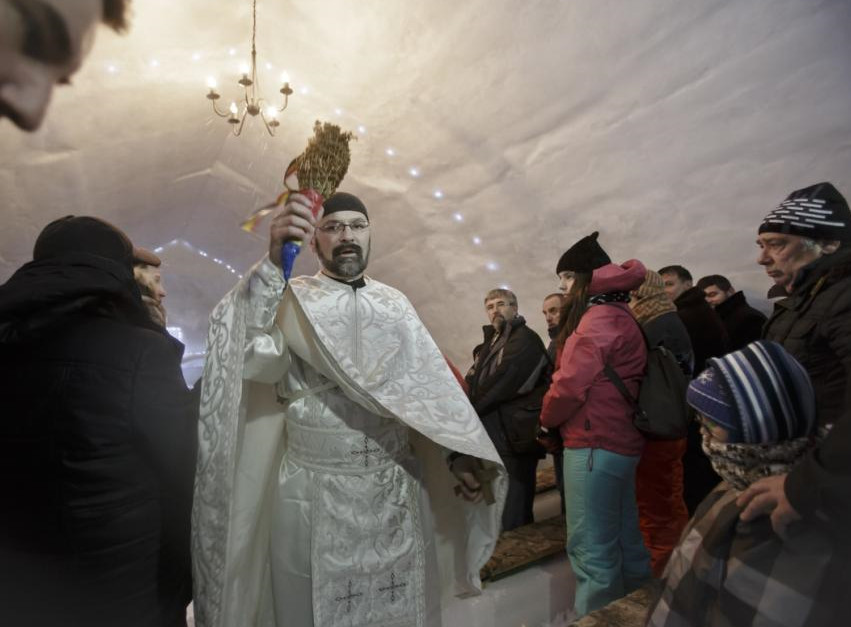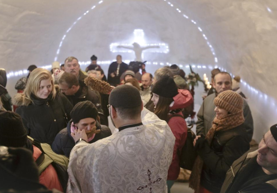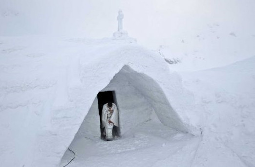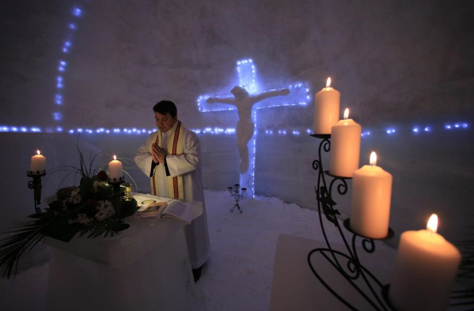 The breath of God does indeed produce ice. A spectacular church made entirely from frozen water has been blessed on top of a rural Romanian mountain. Orthodox, Catholic and Protestant priests held a special service at the so-called “Ice Church” last week. The astonishing structure, which is built from scratch each winter, stands at 6,500-feet high in the Balea Lac resort, northwest of Bucharest, according to Catholic Herald. Created out of chunks of ice, which are then cut and cemented together with water and snow, it is a carbon copy of an old church in Transylvania.