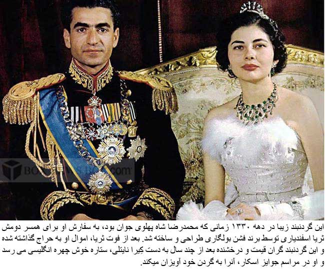 This gorgeous 18-karat gold necklace has flower like clusters centered with bold sapphire cabochon surrounded with emerald, ruby and diamonds. It was originally owned by Princess Soraya till Keira borrowed it.