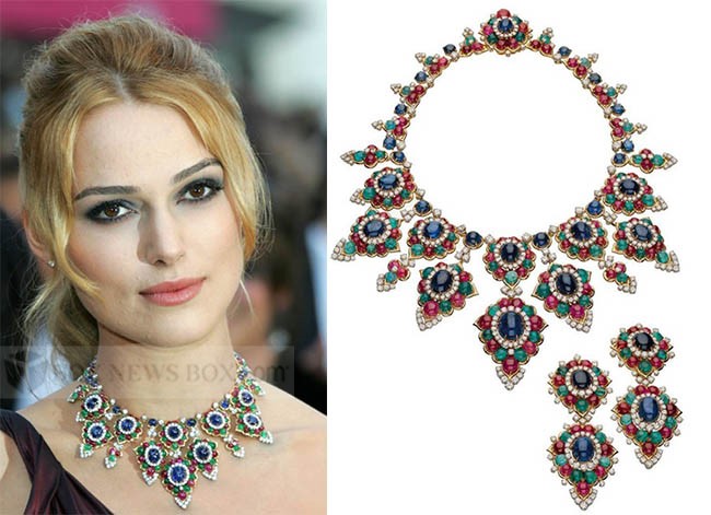 Keira Knightley’s beautiful bib necklace by Bulgari, a 1960 masterpiece from the Italian jeweler’s archive collection, is regarded as one of the most memorable necklaces ever!