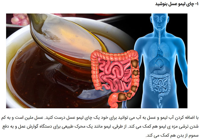 Make a tea by adding honey and lemon to water. Honey is a laxative and also helps to reduce the sourness of the tea caused by lemon. Lemon acts as a natural stimulant for the digestive system and helps in flushing out toxins from the body.