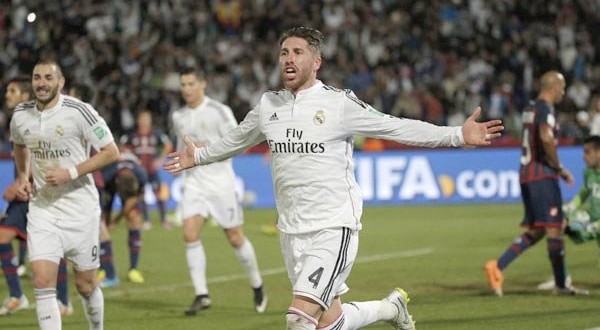 Real Madrid’s Portuguese forward Cristiano Ronaldo (L) kicks the ball next to San Lorenzo’s midfielder Juan Mercier during their FIFA Club World Cup final football match in the Moroccan city of Marrakesh on December 20, 2014