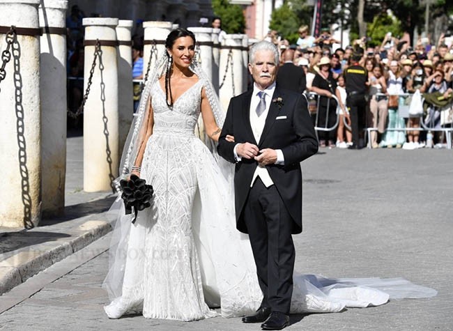 The 33-year-old Ramos, who is from a suburb of Seville, arrived wearing a dark three-piece suit in a discrete check pattern, on the arm of his mother Paqui Garcia, who wore a traditional Andalusian mantilla, or raised head scarf.