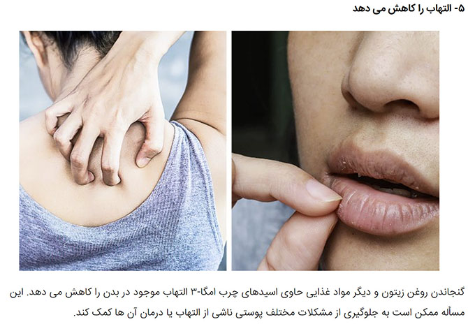 Enriching your diet with olive oil and other foods with omega-3 fatty acids reduces inflammation in the body. This, in turn, may help prevent or heal various skin conditions caused by inflammation.
