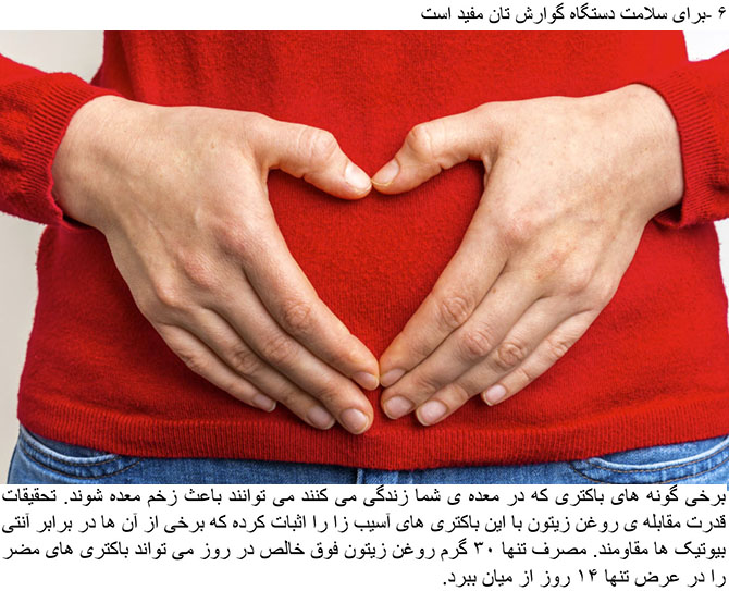 Some types of bacteria that live in your stomach can cause stomach ulcers. Olive oil has been proven to fight damaging bacteria, some of which are resistant to antibiotics. Just 30 grams of extra virgin olive oil a day can kill harmful bacteria in as little as 14 days.