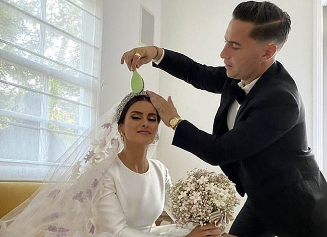 Her fiance Nicolas sported a traditional wedding silhouette that consisted of a plain black tuxedo, a crisp white dress shirt, and a black bow tie.