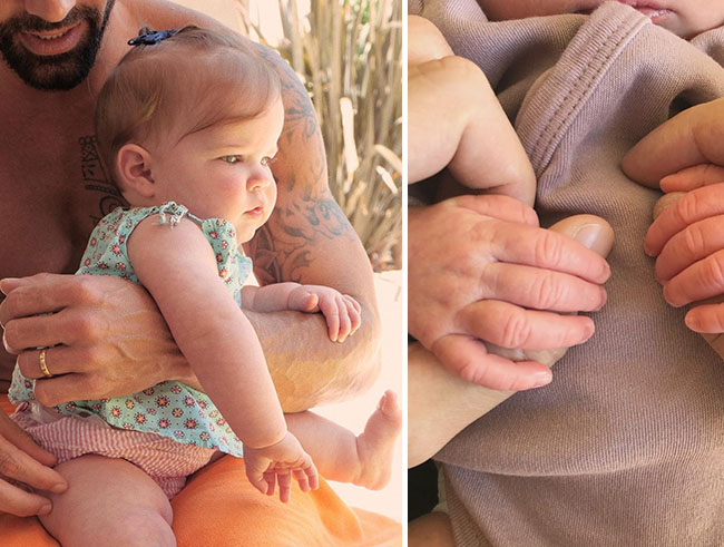 In the adorable picture, Ricky cradles his little girl as she looks off in the distance with her arms dangled over her dad’s arm.