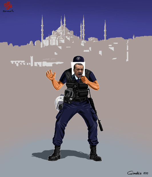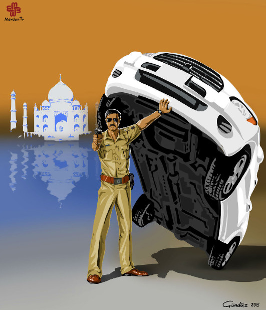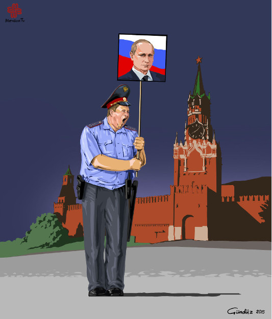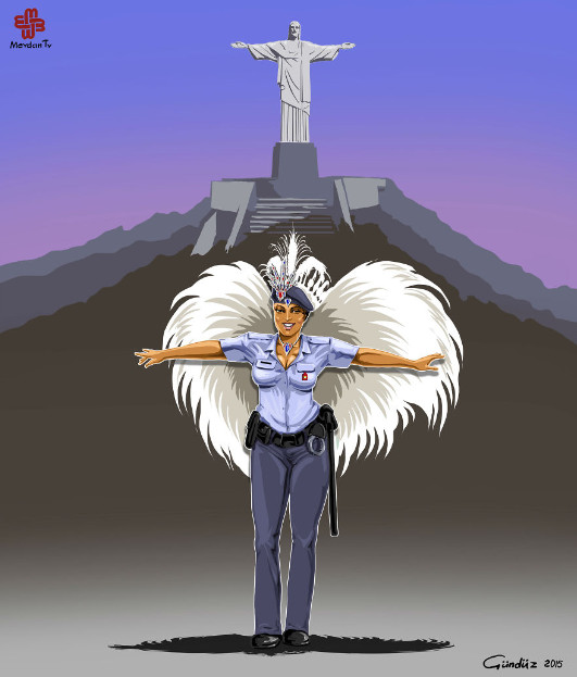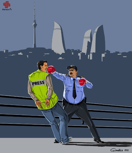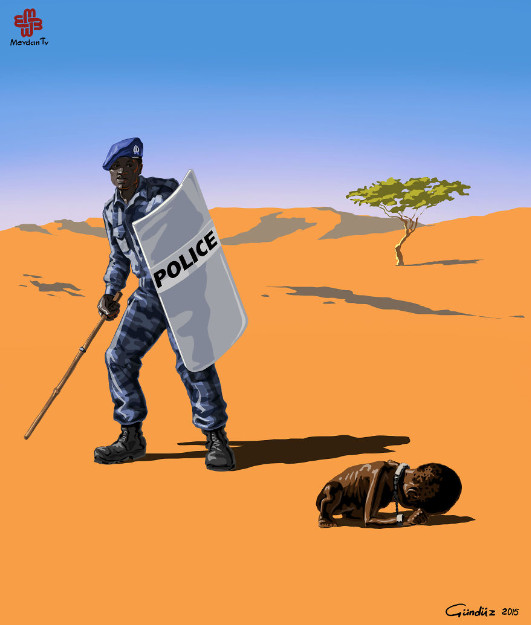 Illustrations by Gunduz Agayev depict police officers in the countries where human rights are abused, such as Russia, Great Britain, USA, China, Turkey, Korea, Sudan, Saudi Arabia, India, etc. Most of the illustrations are sarcastic and critical, while some of them visualize “good police” characters. More info in Facebook.