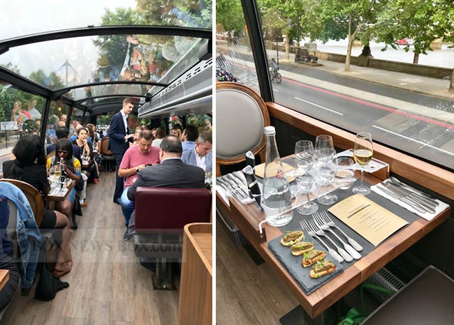 After receiving our booking email, we all promptly arrived to the bus at 7:30pm on the Victoria Embankment. We showed our tickets, boarded the bus and a glass of chilled Champagne greeted us while we got to know our fellow diners.