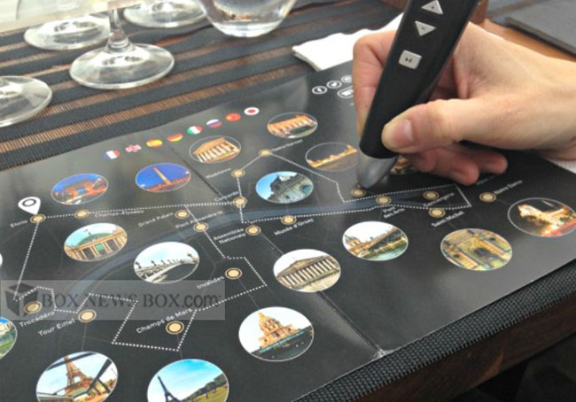 Each diner is presented with a map of London and an electronic pen. Simply dab the pen on a landmark from your map and place to your ear, this little thing will then tell you the complete history of the landmark you’re passing.