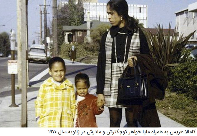 This January 1970 photo Kamala, left, with her sister, Maya, and mother, Shyamala, outside their apartment in Berkeley, Calif., after her parents’ separation.