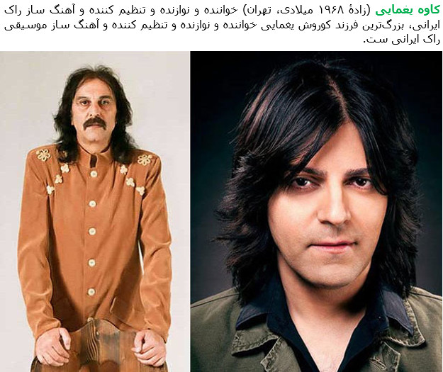 Kaveh Yaghmaei ( born 1968 ) is an Iranian rock musician. He is the eldest son on Iranian legendary singer and musician Kourosh Yaghmaei. He started learning music at age 8 when he attended Tehran Advanced School of Music and also started learning Piano with Iranian teacher Ms Novin Afrooz. In 1981, Tehran’s Music School was closed following the Islamic Revolution in Iran. It was re-opened after few years and Kaveh graduated, while forcefully playing the flute. He then began his professional career of composing and recording music in 1984 and in 1993, Kaveh played his first concert which also was the first Rock concert in Iran after the revolution collaborating with Babak Amini at Bahman Hall. In 1996, Kaveh entered the Islamic Azad University, during which he started playing classical guitar.