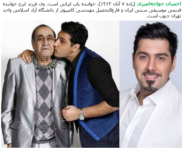 Ehsan Khajeh Amiri (born October 29, 1984) is an Iranian pop music singer. He is the son of famous Persian traditional music singer Iraj. He is also the singer of Iran national football team’s official song for the 2014 FIFA World Cup. His son is Arshan and was born on March 2013.