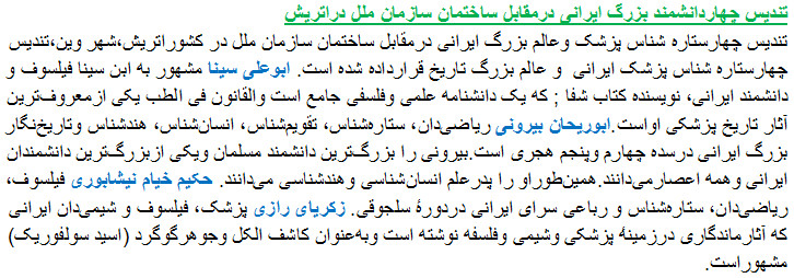 The Austrian capital is set to unveil a pavilion featuring the statues of four prominent Iranian figures in front of the United Nations Office.Highlighting the Iranian architectural features, the pavilion is adorned with Persian art forms and includes the statues of renowned Iranian scientists Avicenna, Abu Rayhan Birouni, Zakariya Razi (Rhazes) and Omar Khayyam. The pavilion will be unveiled during the ceremony attended by the Iranian Vice President for Cultural Heritage, Handicrafts and Tourism, Esfandyar Rahim-Masha’i. Abu Reihan Birouni, considered by some as the founder of Indology, worked in various fields such as astronomy, chemistry, geography and geology. He is also known as the first Muslim scholar to study India and the Brahminical tradition.