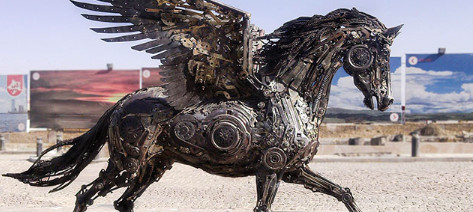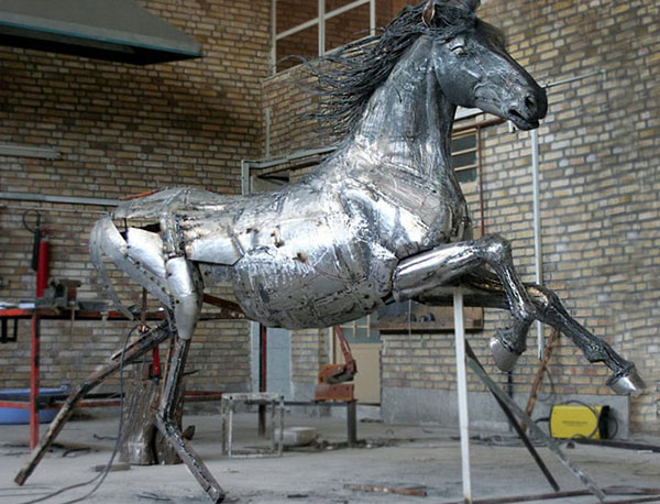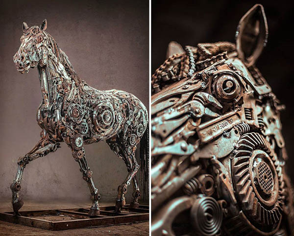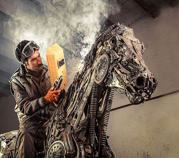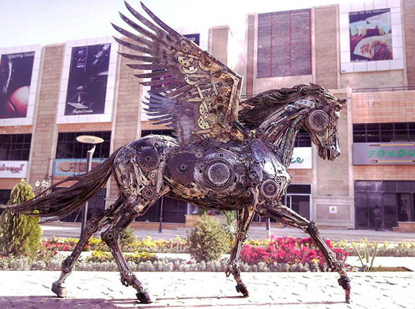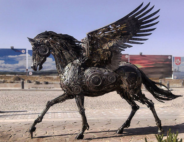 If a steampunk gentleman was to ride a clockwork horse, he would prefer something like the metal sculptures of Hasan Novrozi. This artist who studied in Iran uses all sorts of metal bits and bobs, and scrap metal to make some of the largest pieces his work. Just look how natural both the horse and Pegasus look! And how that’s achieved by making a 3D scrap metal collage – the attention to detail and artistic vision is astounding. Of course, this doesn’t stop Hasan from making more conventional metal art, from parts shaped and welded to fit. The eagle is particularly impressive, so dynamic and natural! One can definitely get the impression that it is about to take off. Novrozi also sculpts with clay and other media, so check out his Facebook! Just like the metal Pegasus. Would prefer to ride that instead of any car.