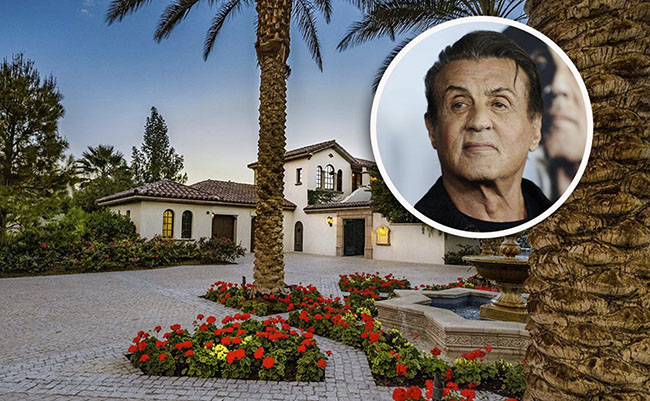 The layout includes four bedrooms and 4.5 bathrooms, and a double-height living room with a stone fireplace. The formal dining room opens out to a terrace.