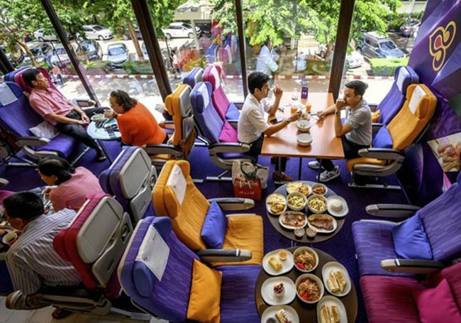 The space in the Thai Airways offices in Bangkok has been completed decked out with plane seats, along with “spare parts from engines, windows and fan blades,” according to Thai Airways Catering’s managing director Varangkana Luerojvong, who spoke with Reuters last week.