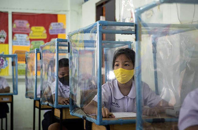 ask-wearing pupils catching up with friends at one Bangkok high school were quickly told to spread out as they headed back to lessons on Wednesday after months of distance learning due to coronavirus restrictions.
