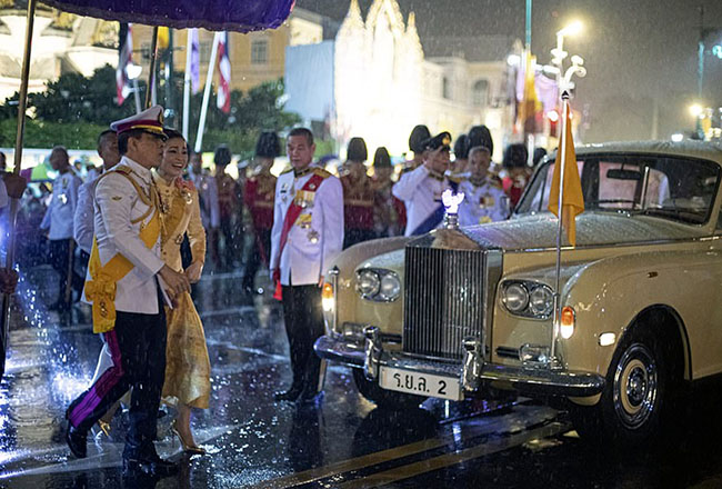 The king, dressed in white, and Queen Suditha, 42, wearing gold and opulent jewels, greeted devoted royalists outside as servants held umbrellas to shield them from the rain.