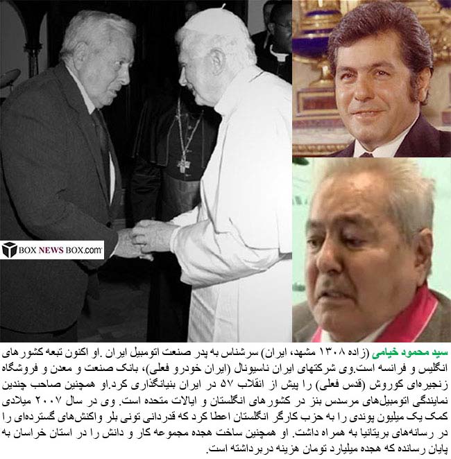 Mahmoud Khayami, CBE, KSS, GCFO born 1930 is an industrialist and philanthropist, of French nationality.Iran National was destined to become the largest industrial complex, today known as Iran Khodro or IKCO.It was announced by the Department of Education and Skills in 2005 that Mr Khayami had become a sponsor of the UK Government’s Academy programme and had sponsored two academies which will open in Sheffield during 2007. Both academies will be run by a leading Anglican Church School Trust. It is well known that he is a friend of Tony Blair whom he has met on a number of occasions.. He was appointed by The Queen as an Honorary CBE in 2011 for services to education.He appeared in the 2008 Sunday Times Rich List.