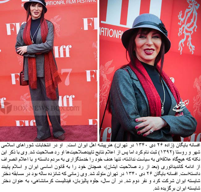 Afsaneh Bayegan (born 2 January 1961) is an film and television actress and beauty pageant titleholder who placed 2nd Runner-Up at Miss 1976. , her artistic career started with the short film Boogh or The Horn by Ali Alinejad (1982).