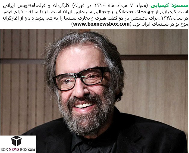 Masoud Kimiai ( born 29 July 1941 in Tehran) is an Iranian director, screenwriter and producer.in 1991, he was awarded a prize in 41st Berlin International Film Festival for his Snake Fang (Dandan-e-mar). This was not his sole international prize. At the Cairo International Film festival in 1979 he got from the International Catholic Organisation for Cinema (OCIC), the OCIC Prize for his film The Journey of the Stone (Safar Sang). The international OCIC jury gave its award to this film because The Journey of the Stone denounced the exploitation of mankind by mankind and called for a more just social order. He has been married 3 times. He was married to the late Iranian pop singer Giti Pashaei until 1991, afterwards he married the Iranian pop singer Googoosh.